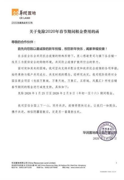 華潤置地1月29日宣布,減免全國各商業項目所有商戶自1月25日至2月9日時間內(共計16天)的租金,涉及全國約14000個店鋪。公開資料顯示,截至2019年12月31日,華潤置地在全國運營已開業購物中心共61個(包括萬象城、萬象匯、五彩城、萬象天地、鳳凰匯),遍布全國40座城市。截至目前,已全面關閉全國19個商業項目,但同時保證超市等涉及民生需求的店鋪仍持續經營。未關閉的商業項目均大幅縮短了經營時間,將在崗員工數量減至最低。
