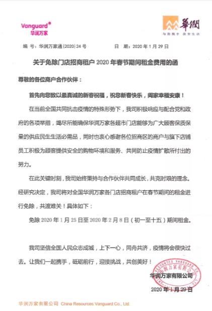 同日,華潤萬家宣布,免除全國各門店招商租戶在春節期間(2020年1月25日至2月8日)租金(含物業管理費),共惠及商戶全國約14000家,涵蓋經營面積約184萬平米,減免金額約1.3億元。