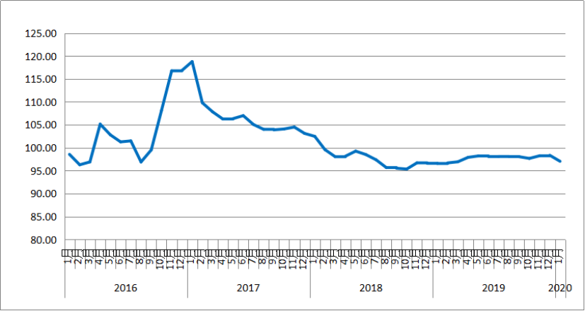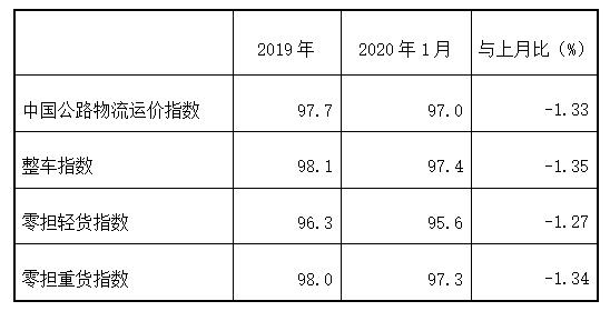 2020年1月份,由中國(guó)物流與采購(gòu)聯(lián)合會(huì)和林安物流集團(tuán)聯(lián)合調(diào)查的中國(guó)公路物流運(yùn)價(jià)指數(shù)為97點(diǎn),比上月回落1.33%,比去年同期增長(zhǎng)0.5%。月內(nèi)各周指數(shù)整體呈回落趨勢(shì),其中第一、三、四周環(huán)比回落,第二、五周環(huán)比回升。