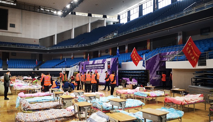 中國一冶突擊隊(duì)火速建設(shè)武漢洪山體育館“方艙醫(yī)院”。