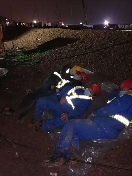 施工間隙,累到極致的華潤燃?xì)饨ㄔO(shè)者們就地休息。