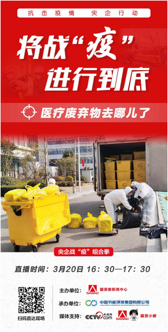 新冠肺炎疫情發生以來,接觸病患的高危醫療廢棄物劇增,如何安全銷毀這些沾染物?如何避免廢棄物運輸、銷毀過程中病毒擴散?為安全銷毀醫療垃圾,降低二次污染可能性,中國節能集團嚴陣以待。3月20日的《央企戰疫組合拳》將連線徐州市危險廢物集中處置中心有限公司,帶大家走過醫療廢物收集處置的全流程,讓大家懸著的心踏實落地。