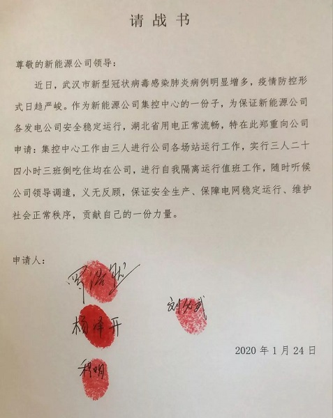 在這次“抗疫保電”的工作中,面對復雜嚴峻的疫情,羅浩然毫不猶豫放棄了春節假期,主動請纓,帶領集控中心其他3名值班員,寫下請戰書,要求堅守在“抗疫保電”第一線。1月23日,武漢“封城”。1月24日,湖北省啟動重大突發公共衛生事件一級應急響應。面對不斷蔓延的疫情,公司面臨著防疫和保電的雙重壓力,羅浩然所在的集控中心承擔著公司19個投運風電場及光伏電站生產管理的中樞功能。“疫情就是命令,防控就是責任。”由于集控中心位于武漢徐東大街的湖北能源大廈,為避免換班及路途往返造成的感染風險,經公司同意,羅浩然調整值班安排,帶領兩名值班員24小時在集控中心值班。