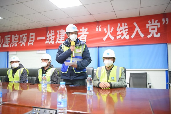 2月2日,中建三局火神山醫院項目現場指揮部臨時黨委研究并報中建三局黨委,同意金暉、潘吉建、張克強等8名同志“火線入黨”。現場,金暉作為預備黨員代表表態:“加入中國共產黨是一份光榮,更是一份責任,我們愿同大家一道,不忘初心,不計回報,逆風而行。”工程建設爭分奪秒,全員都投入在施工一線,入黨儀式后,預備黨員立刻回到各自崗位,為沖刺項目交付節點全力拼搏,終于保證醫院如期交付投用。