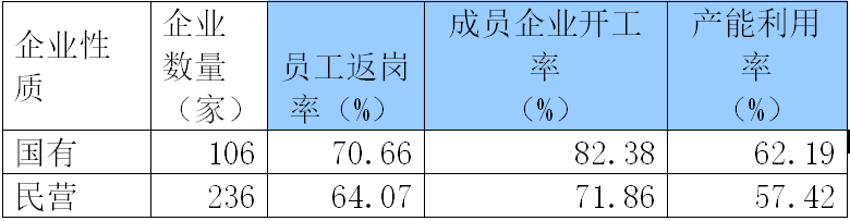 調(diào)查結(jié)果顯示,國有企業(yè)平均返崗率、成員企業(yè)開工率、產(chǎn)能利用率分別為70.66%、82.38%、62.19%;民營企業(yè)平均返崗率、成員企業(yè)開工率、產(chǎn)能利用率分別為64.07%、71.86%、57.42%??傮w上看,國有企業(yè)的各項(xiàng)指標(biāo)明顯優(yōu)于民營企業(yè),民營企業(yè)復(fù)工復(fù)產(chǎn)的困難和問題更多一些。