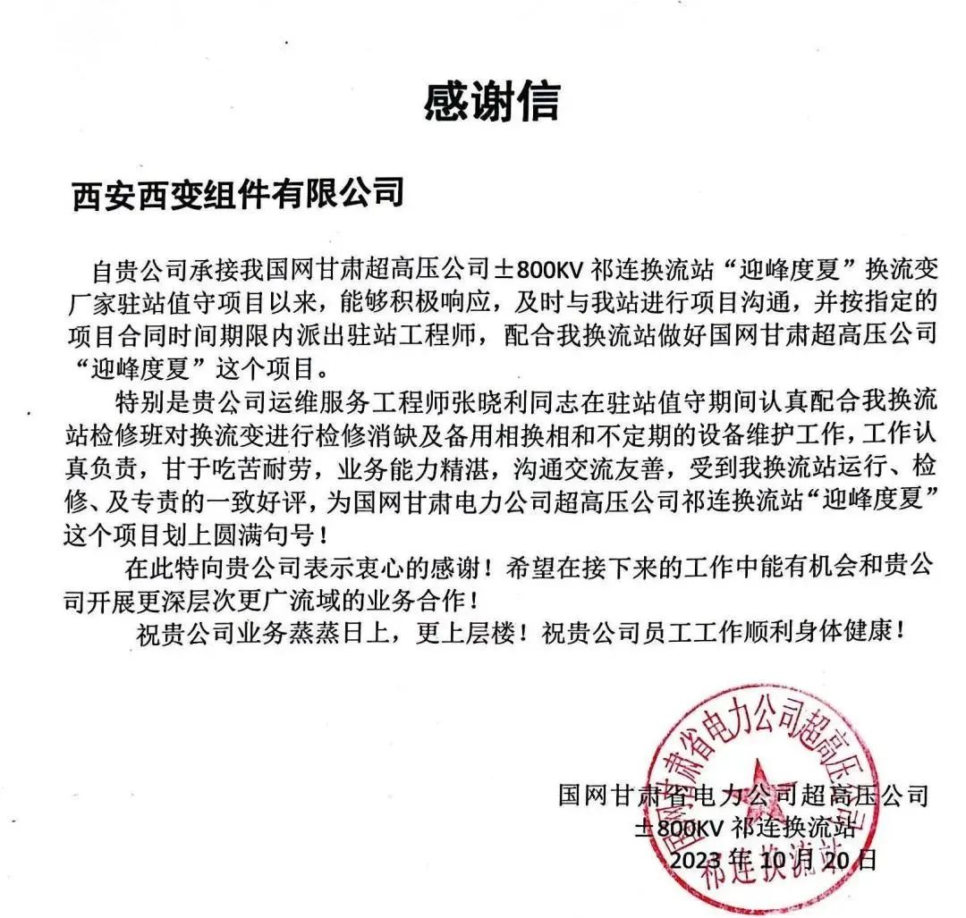 近日,西變組件收到來自國網甘肅省電力公司超高壓公司±800kV祁連換流站發來的感謝信。