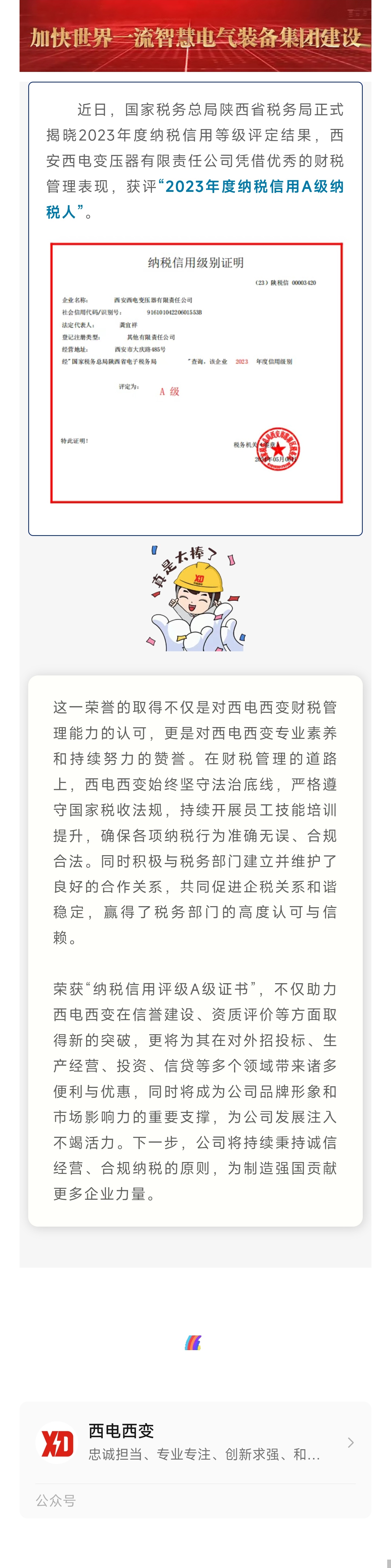 喜報丨西電西變獲評2023年度“納稅信用A級納稅人”