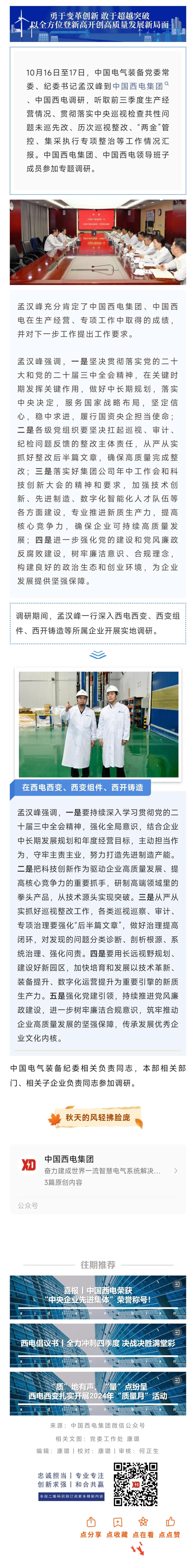 中國電氣裝備黨委常委、紀委書記孟漢峰到西電西變調研